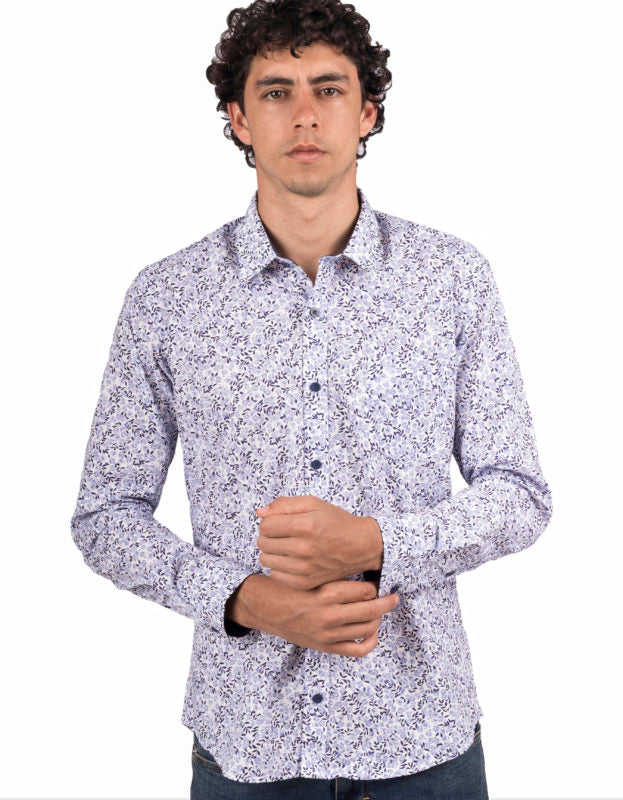 Camisa Manga Larga Estampada Flores Azule Celeste - Moldería slim