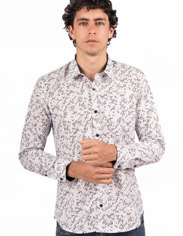 Camisa Manga Larga Estampada Rosas Grises Hojas Negras - Moldería slim