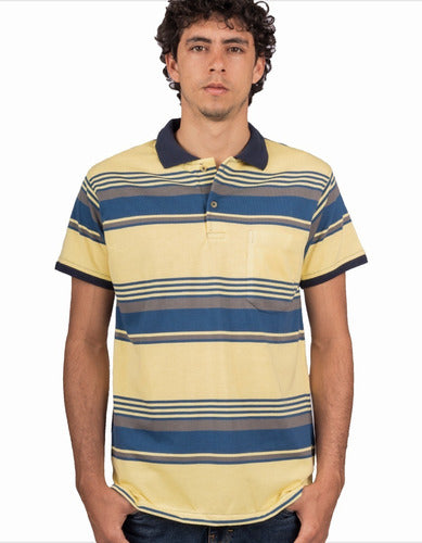 Camiseta Tipo Polo Rayas Amarillo Claro, Azul y Gris